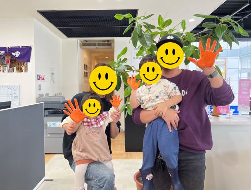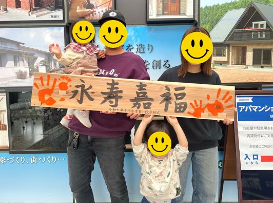 ご家族皆さまで板に思いを込め、記念の手形を押していただきました。
