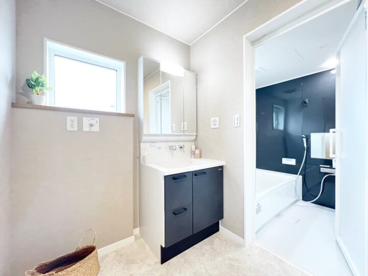 キッチンと洗面脱衣室が一直線に配置された間取りは、家事の負担を軽減します。