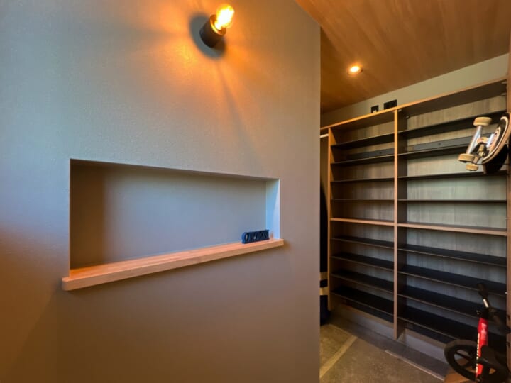 玄関のシューズクロークにはパンチングボードを採用し、スケートボードやロードバイクを“見せる収納”としてすっきりと配置。