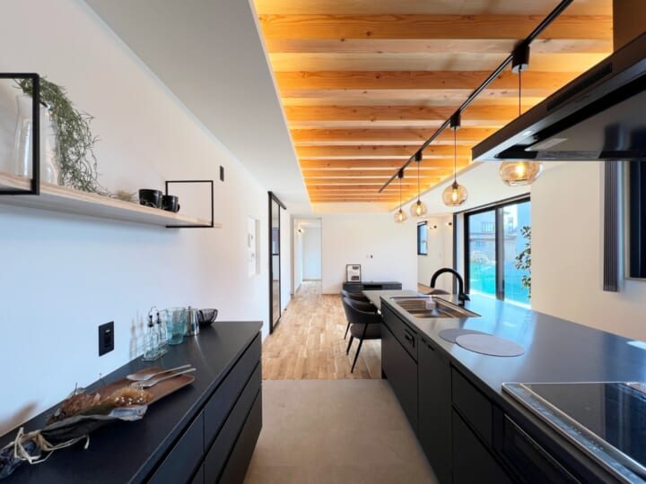 アイランドキッチンと勾配天井で開放感溢れるおうち