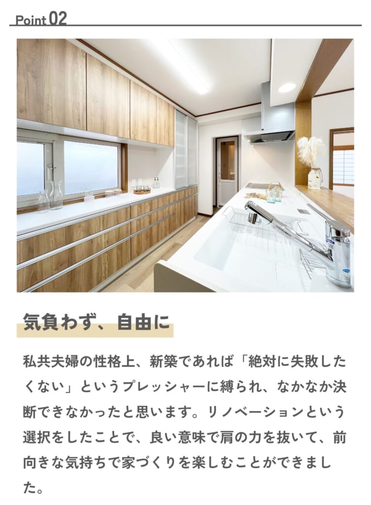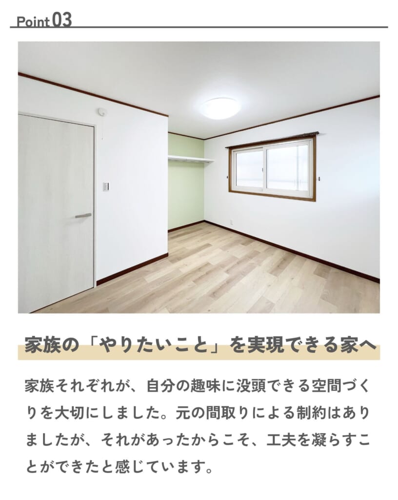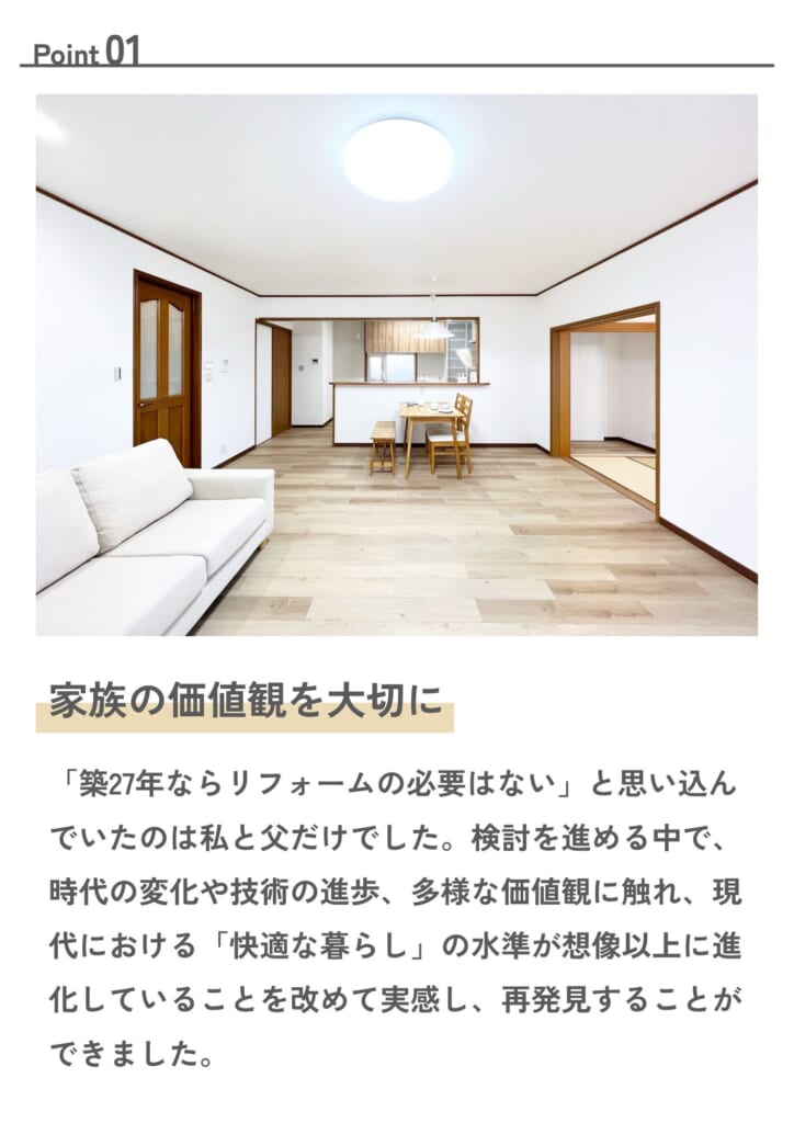 当初は希望や期間など具体的なイメージが不十分な状態でしたが、背中を押していただいたおかげで家族間の話し合いも深まり、納得のいく形で進めることができました。また、リノベーションを通じて、これまで知らなかった実家の一面や建築当初の両親と施工に携わった方々の想いを感じることができました。何よりも、毎週のように続く打ち合わせでしたが、子供たちが喜んで貴社を訪れられるようご配慮いただいたこと、心より感謝しております。